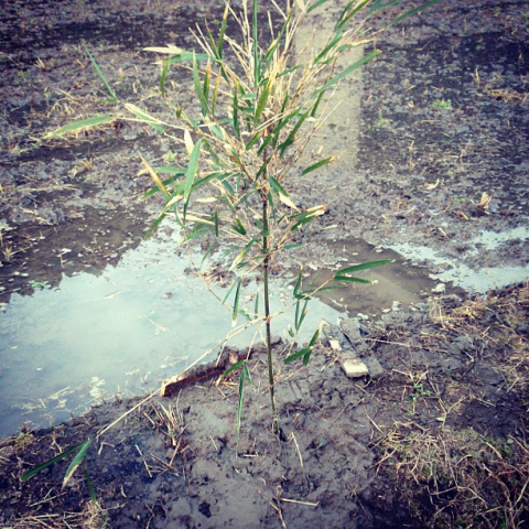 引き続き田んぼに水を溜めてます。水の出口(水尻)から水が漏れてたので昨朝板を補強したんですが…夕方見にいってみると…うっ!出口自体が塞がれて笹が刺してある。こんな粋で世話焼きな事をするのはあの爺ちゃんしかいない。電話したらやっぱり。 #米 #人々