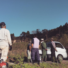 夕暮れの中、台湾からのお客さま。大豆畑で麦茶を飲んでもらいました。 #お客さん