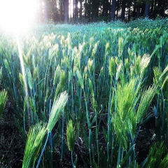 シャープネスにもほどがある。夕陽に沈んでいく麦畑、奥には米良大根の白い花畑。 #畑の風景 #麦