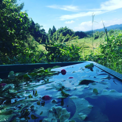 まず、精麦所で削ってもらった麦をザルからザルへ移しながら細かいゴミを風で飛ばします。
