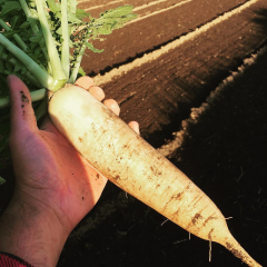 ご褒美は初どれ米良大根。虫に負けずにがんばってここまでよく大きく育ってくれました。今晩お鍋でいただきます。 #米良ダイコン