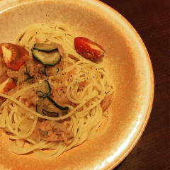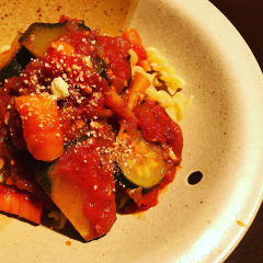 本日は冷製パスタ。炒め玉ねぎとニンニクの風味とブラックペッパーが爽やか!トマトはフードカーニバルでご一緒したごくとまさん!