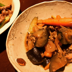 冷蔵庫の野菜在庫一掃となるバター炒め!アンド、ナスがとれたから早速の味噌煮浸し!しかしこちらにもズッキーニが紛れ込ませてあるのであった。