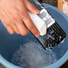 こうして形が不揃いな米良大根を一本ずつすりおろしていますが、今日みたいに風が強すぎる時は飛ばされて全部ダメになってしまうこともしばしば…