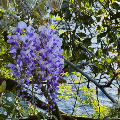 時速60km以上でみながビュンビュン通り過ぎる川沿いの道で、西陽に揺れる藤の花が目にとまりました。