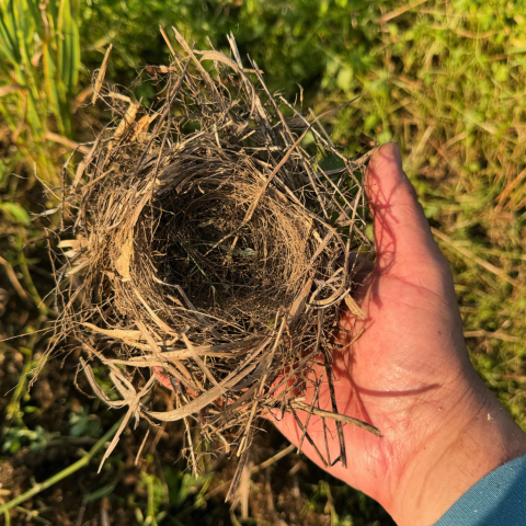 ヒバリの巣。手に取ると本当に温かくて、小さな体でセッセと草を集めて作りあげた健気さに心が温まります。