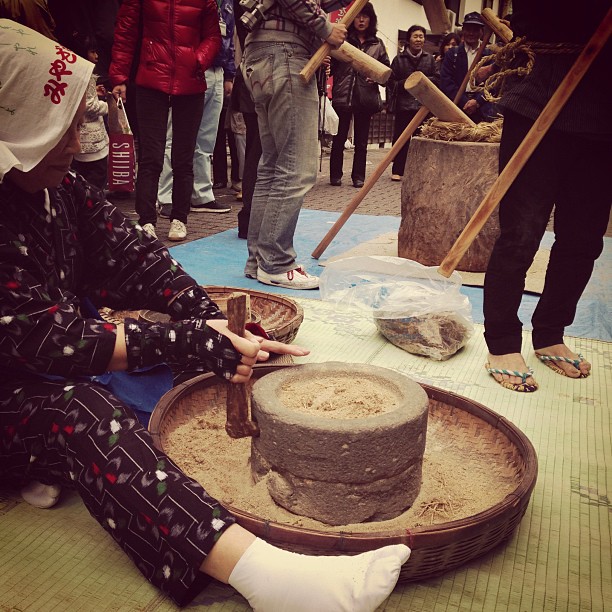 ひえつき、でいいのかな。実演的にお祭りの真ん中でこういうのがあること自体感動です。石臼ってすごい。