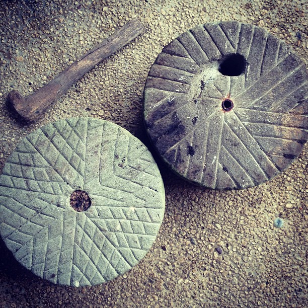 石臼ゲット!心棒取り出すのが大変そうだけど目は割としっかりしてる。下臼の模様がなんか独特…幾何学的じゃないのが温かいけどこれでもちゃんと出てくるんだろうか?なんにしてもニヤニヤです。 #骨董