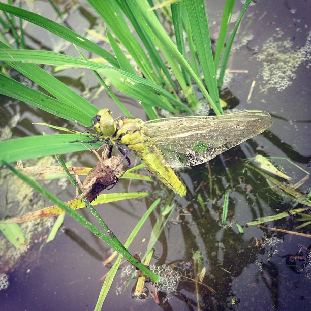 田んぼ草取り中、成虫になったばかりのトンボさん発見。周りから除草剤まけって散々言われてますがまきません。こういうの見ると余計そう思う。 #米
