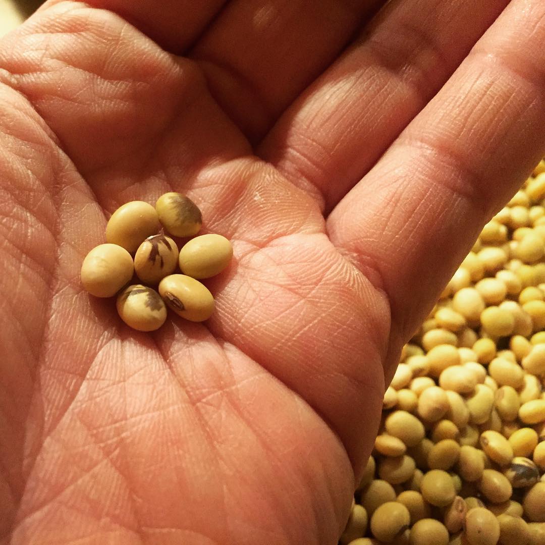 この麻尻大豆は普通よりも小さくて少し平べったい。若干青味がかり1割ぐらいこんなトラ模様が入るのが特徴。味は大げさに言うと「ねっとり」。少し口に残るような大豆の味わいがたまらなく美味しい。これまで「麻尻大豆」として売ってきたけど、大豆として売る時は別の名前で売った方がいいかもしれない。 #ごはん豆 #麻尻大豆 #自家採種 #在来種