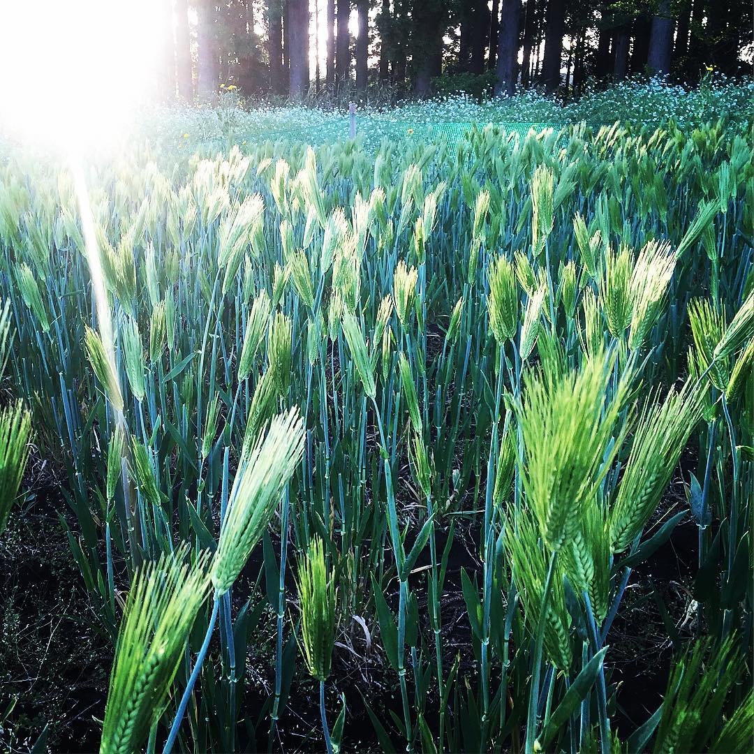 シャープネスにもほどがある。夕陽に沈んでいく麦畑、奥には米良大根の白い花畑。