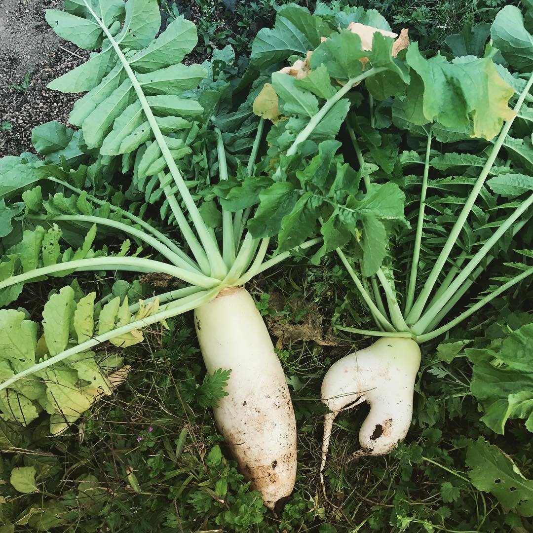 帰りがけにふと、法面に米良大根の葉っぱを見つける。そこは一昨年に大根を捨てた場所。虫一匹ついていない、本当に綺麗で大きな大根ができていた。畑に蒔いた大根にはあんなに虫がたくさんついているのに、なぜこの大根にはこんなに虫がつかないのか。その答えはやっぱり「多様性」にあると思う。 #自然栽培 #多様性 #米良ダイコン
