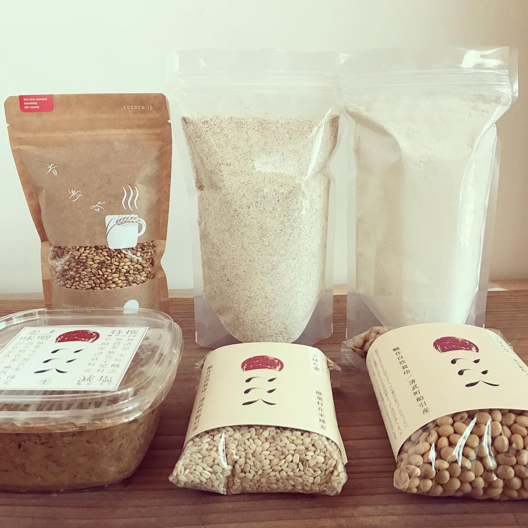 来年は粉が仲間入り。現在パッケージ開発中です。そしてもしかすると米と塩も加わるかもしれません。 #麦味噌 #ごはん麦 #ごはん豆 #むかし麦茶 #パッケージ