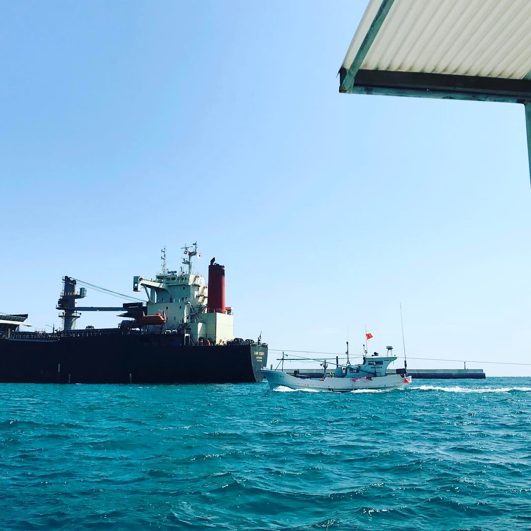 2回目に沖に出ようと思ったらタンカーが。これが来るとスクリューで海底のものをまきあげるので海の色が変わってしまう。うねりのある中、さらに沖へ。危うく酔うところでした。が、無事に全て終了です。美味しいお塩になりますように。 #沖の潮