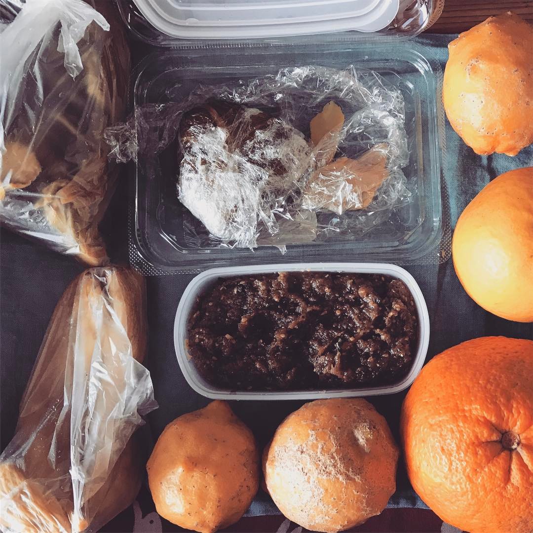 またまたおむかいのおばちゃんから全て自家製がやってきた!油味噌、おにぎり、沢庵、高菜漬け、レモン、日向夏…やいやこらもらいすぎじゃわぁ #人々