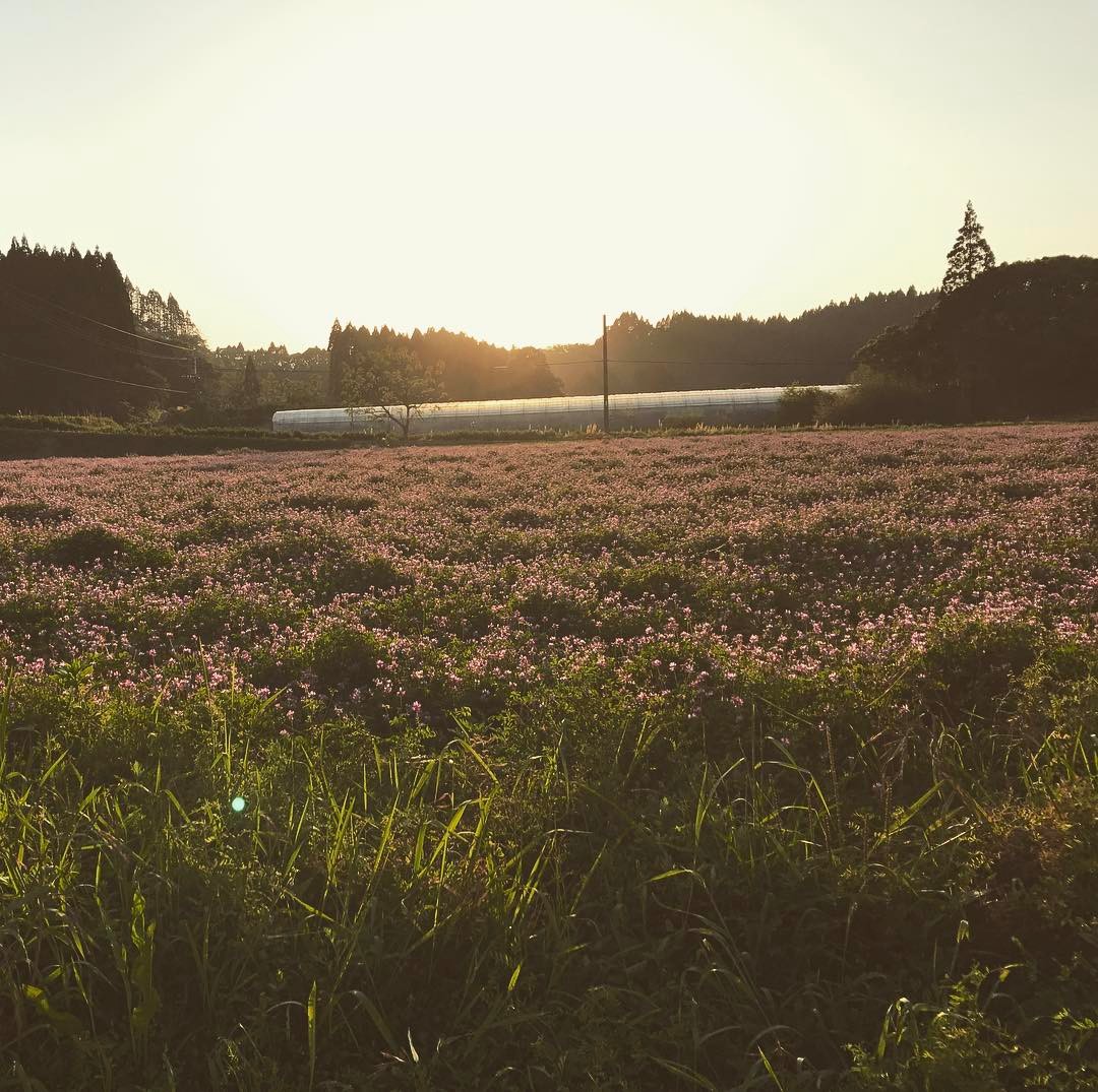 畑からの帰り道。田んぼに咲く蓮花と夕陽が綺麗でした。