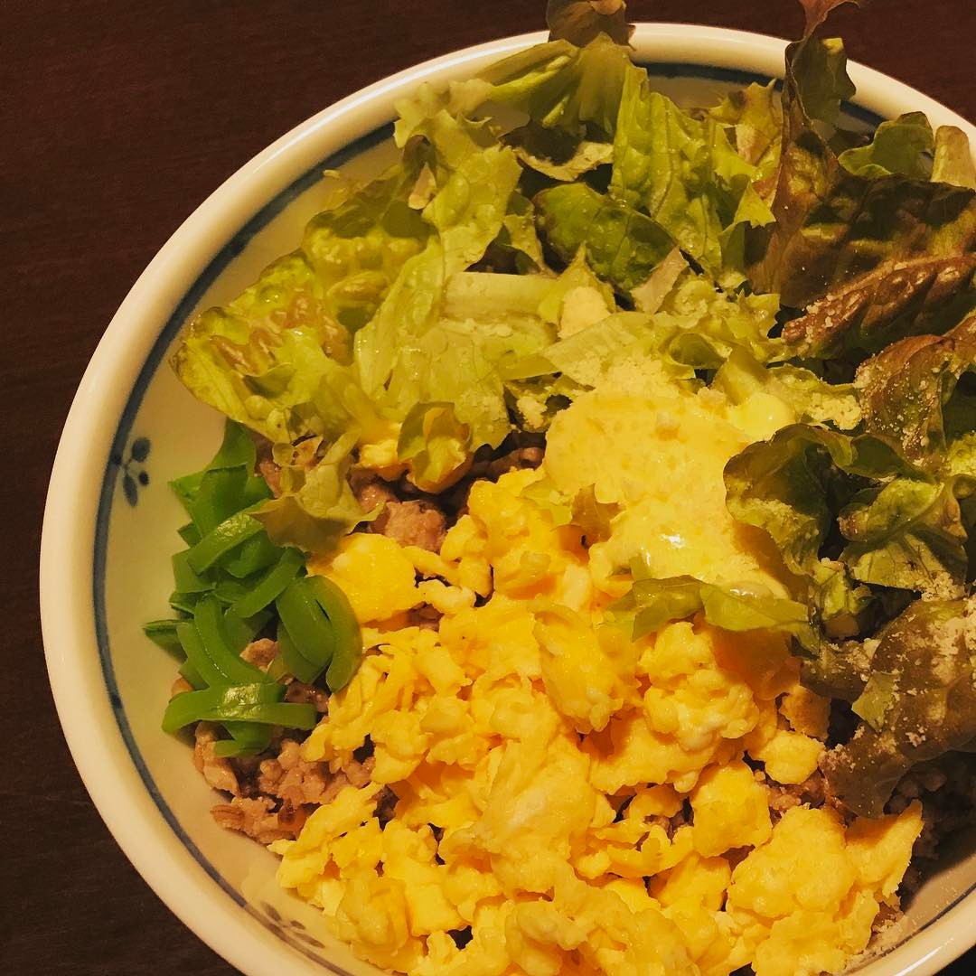 名付けてそぼろサラダ丼!味噌で味付けしたそぼろ肉(麦茶の出涸らし入り)、タマゴ、茹でて刻んだスナップエンドウ、たっぷりサニーレタスにマヨネーズ。なかなか子供たちに好評でした。 #むかし麦茶 #麦味噌 #お父さんごはん