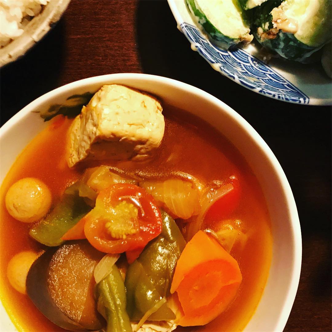 疲れているせいかスパイシーなスープが飲みたかった。茄子、トマト、インゲン、ピーマン、ジャガイモ、ニンジン、タマネギなど、野菜盛りだくさんの鶏ガラベースケチャップ煮。豆腐は冒険だったけど福永豆腐店の固めなのがよかった。 #お父さんごはん #ラディッシュ #ナス #タマネギ #ニンジン #インゲン #豆腐