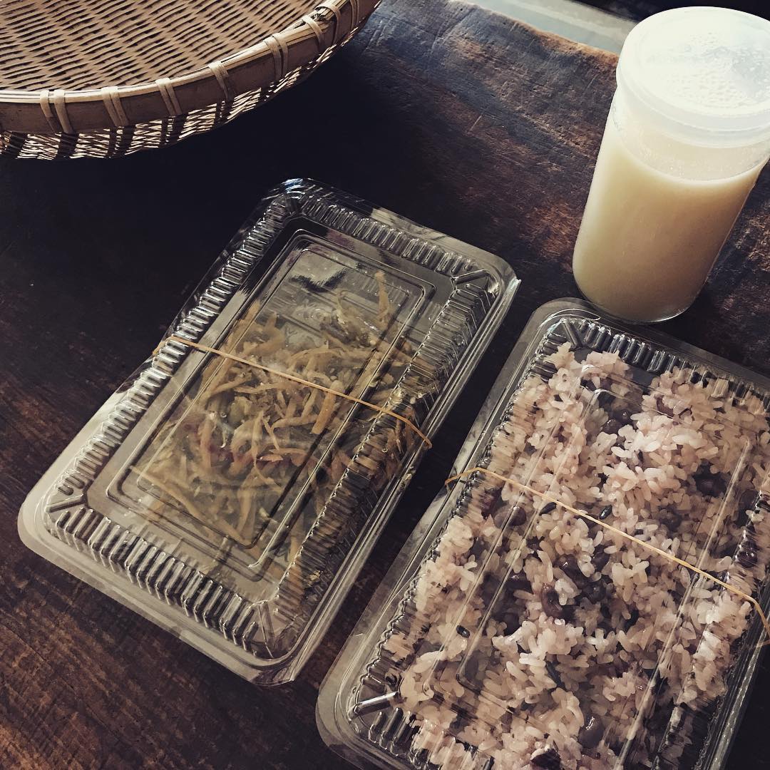 またちーちゃんがいろいろ持ってきてくれたよ^ ^ 在来小豆で炊いた赤飯に甘酒、きんぴらゴボウ。 ※ちーちゃんは加工場のお向かいに住むおばちゃんです。 #人々