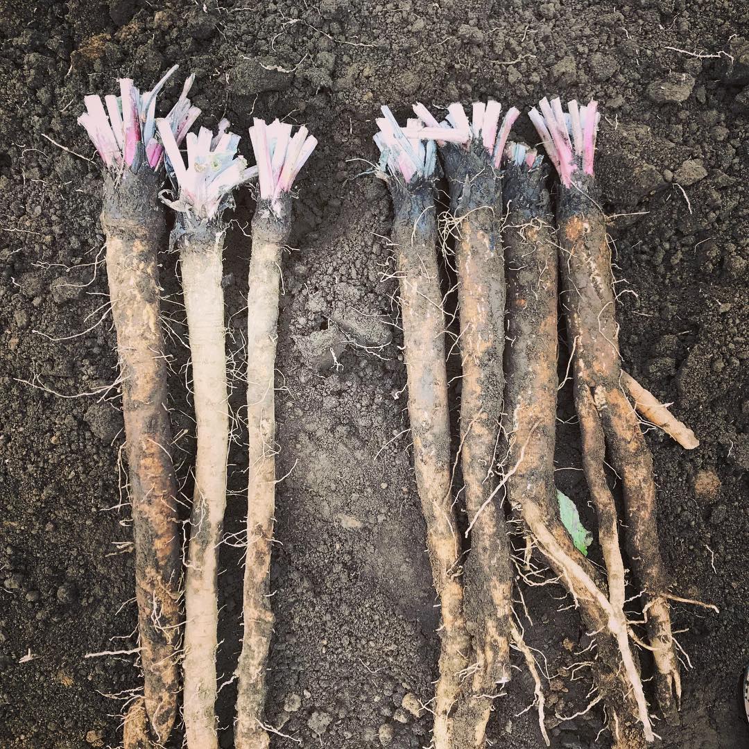 本日はゴボウ掘り。左が滝野川ゴボウ、右が大浦ゴボウ。ゴボウはこの二種類しかありません。滝野川に比べて大浦ゴボウはめちゃくちゃ太くなるのが特徴です。 #大浦ゴボウ