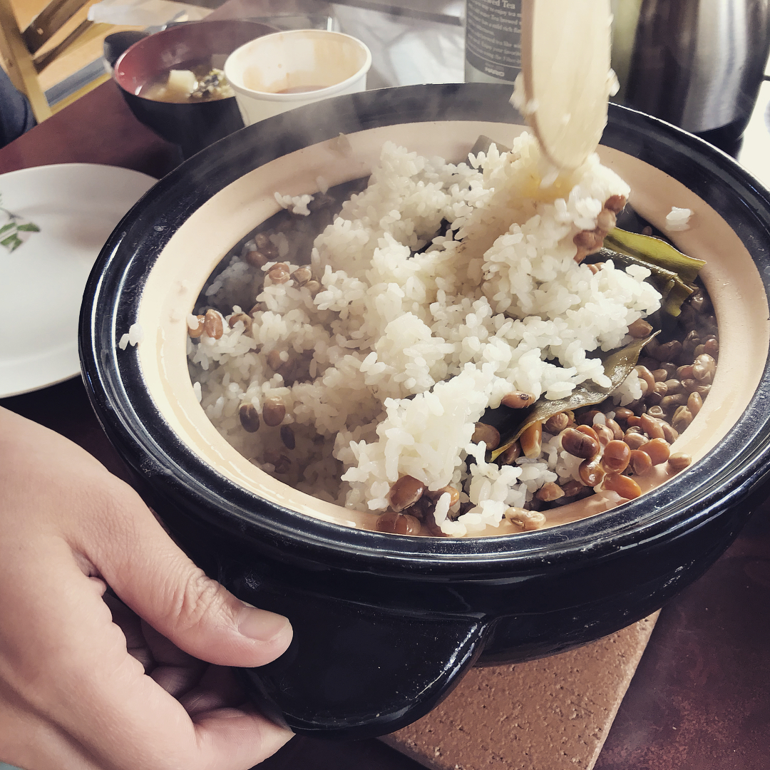 カマドで炊いた麻尻大豆は陽の光を浴びてキラキラ光っていました。ごはん豆をみんなで食べた、持ち寄りお昼ごはん。お味噌汁はうちのキャベツと米良大根、米も我が家の自家製。一生懸命育てたものを、大切にごはんにしてくださり、おいしいおいしいと目の前で食べてくださる…なんて至福の時間でしょう。最後はみんなでお味噌を仕込みました。うららかな春の日。素敵な時間をありがとうございました。 #味噌造り #ワークショップ