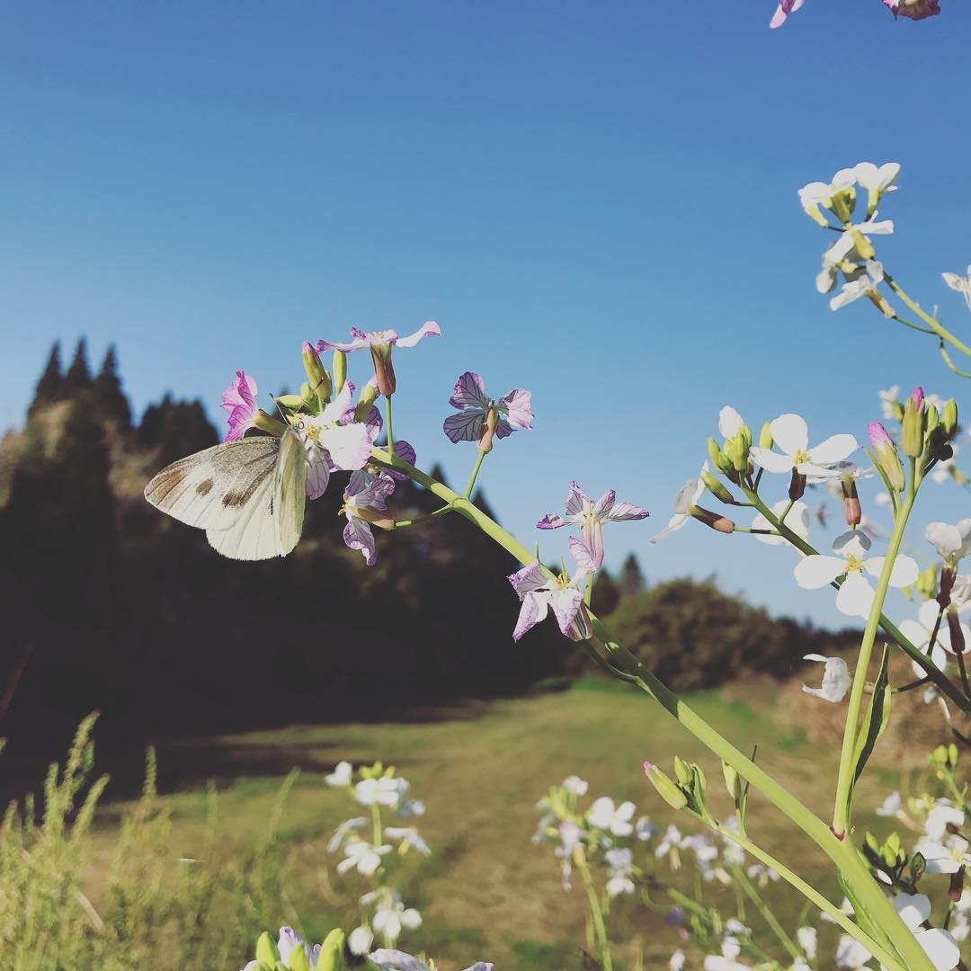 ほぼ満開となった大根の花。今年も少しピンク色が挿す花が。ここからとった種は少しだけピンク色が挿す大根になります。来年が楽しみです。 #米良ダイコン #自家採種 #野菜の花