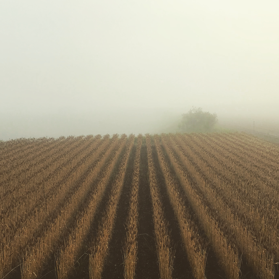雲の上に来たような、霧の中の麦畑。