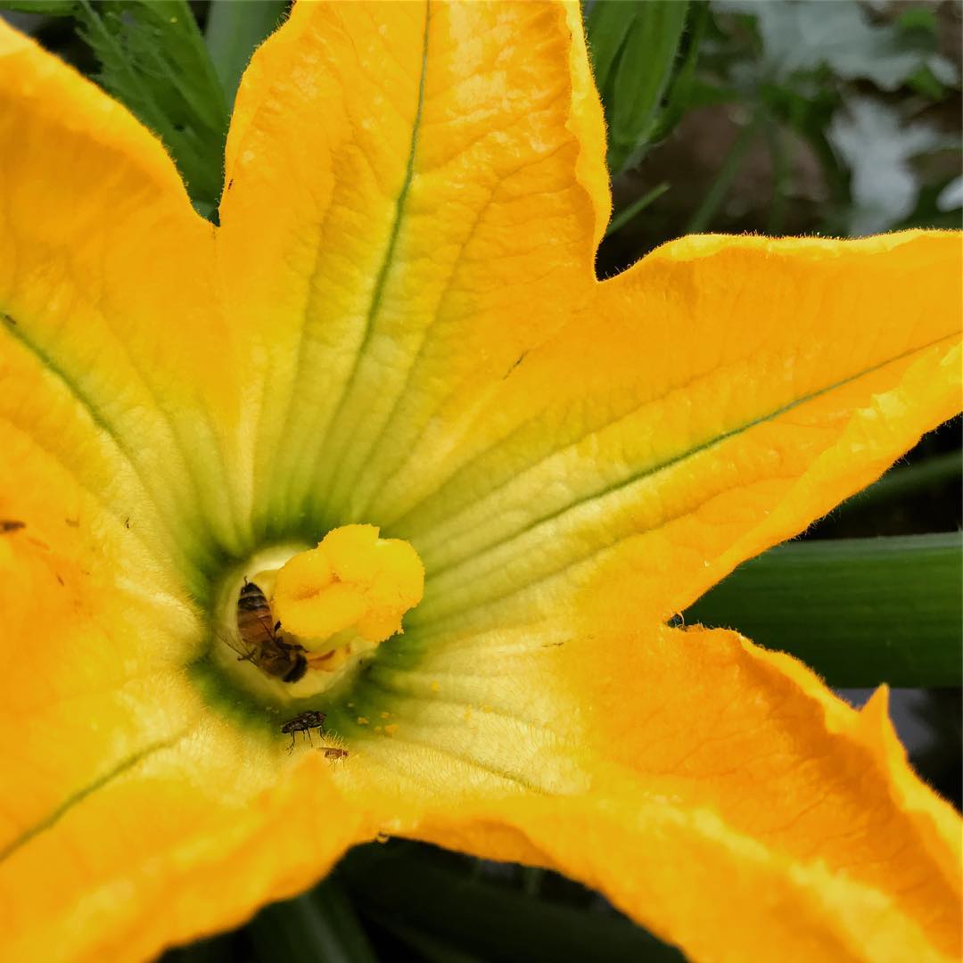 ズッキーニの雌花。まず雄花が咲いてそこに虫が集まり、花粉をつけた虫が遅れて咲く雌花に移動して受粉するようになっています。