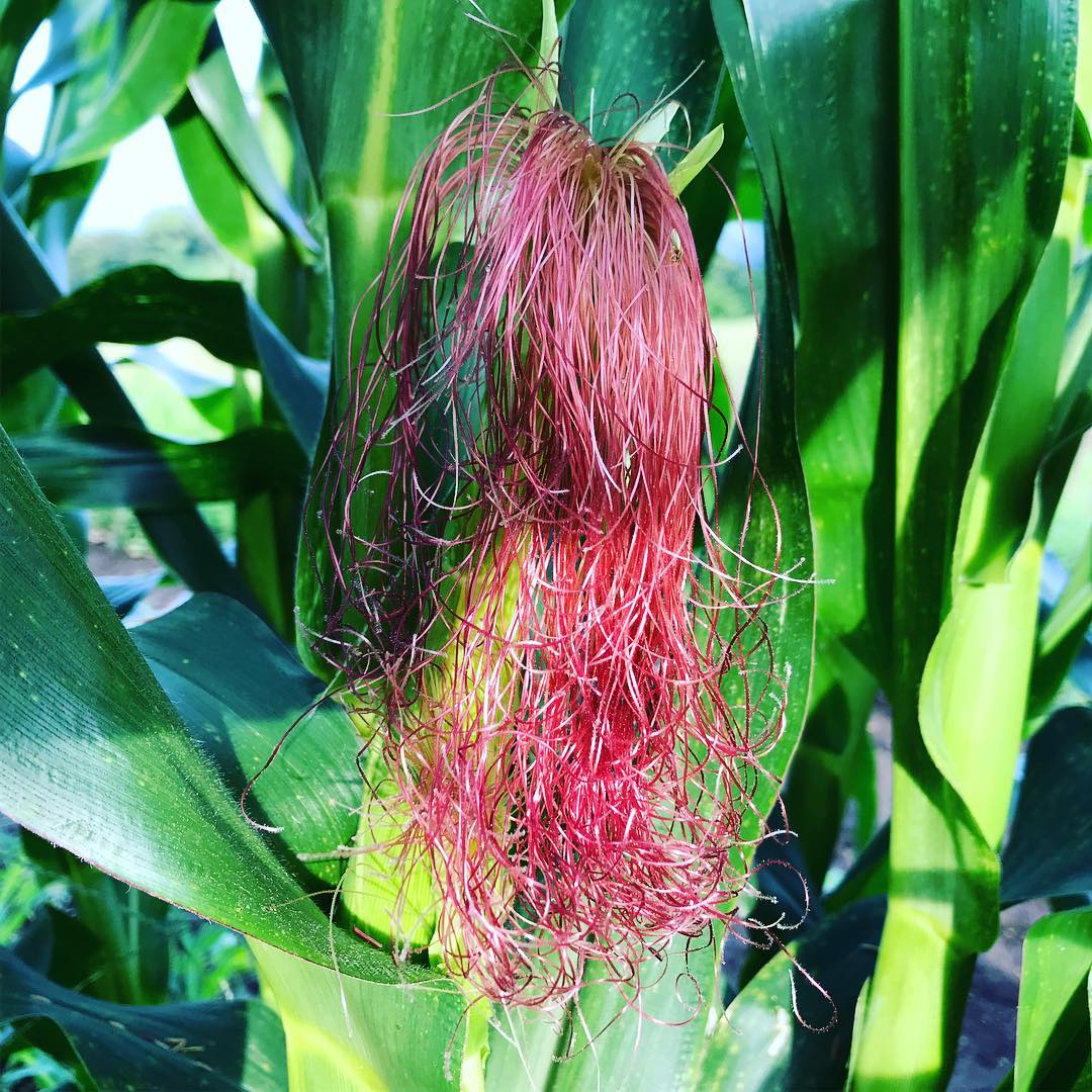 もちきびがパンクになってきました。これは髪の毛じゃなくて雌しべ。この雌しべの本数だけ実があるそうです。雄しべはてっぺんに出てくるススキのようなもの。そろそろ猿もこのパンクヘアーに目をつけているはずです。 #もちきび #在来種