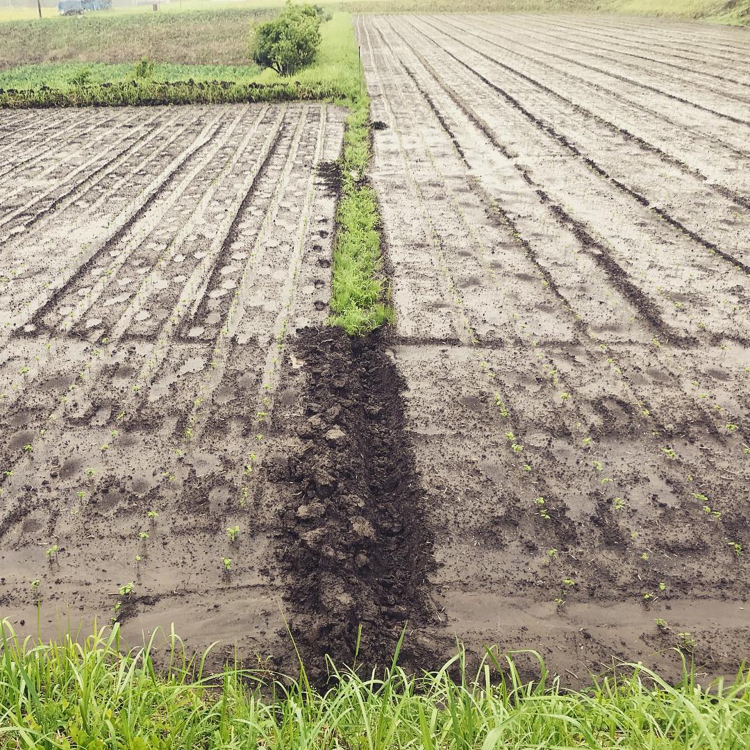地主さんがこんな畑のど真ん中に側溝を掘ってて、トラクターでまわるときに都合が悪いから一部埋めてしまってたんだけど、今回の台風による大雨で必要性がよく分かった。排水大事。向こう側も排水良くなるように掘っておきました。今日は速攻でびっしょりです。 #台風