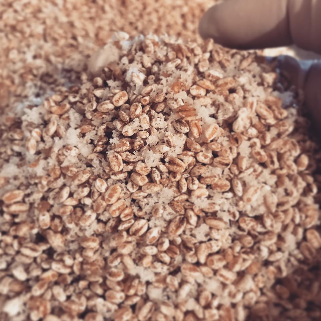 写真は麹に塩を混ぜる塩きりという作業をしたところ。この時点で麹菌は死滅して役割を終えます。麹菌はカビなので、塩の浸透圧で細胞が破壊されてしまうのです。