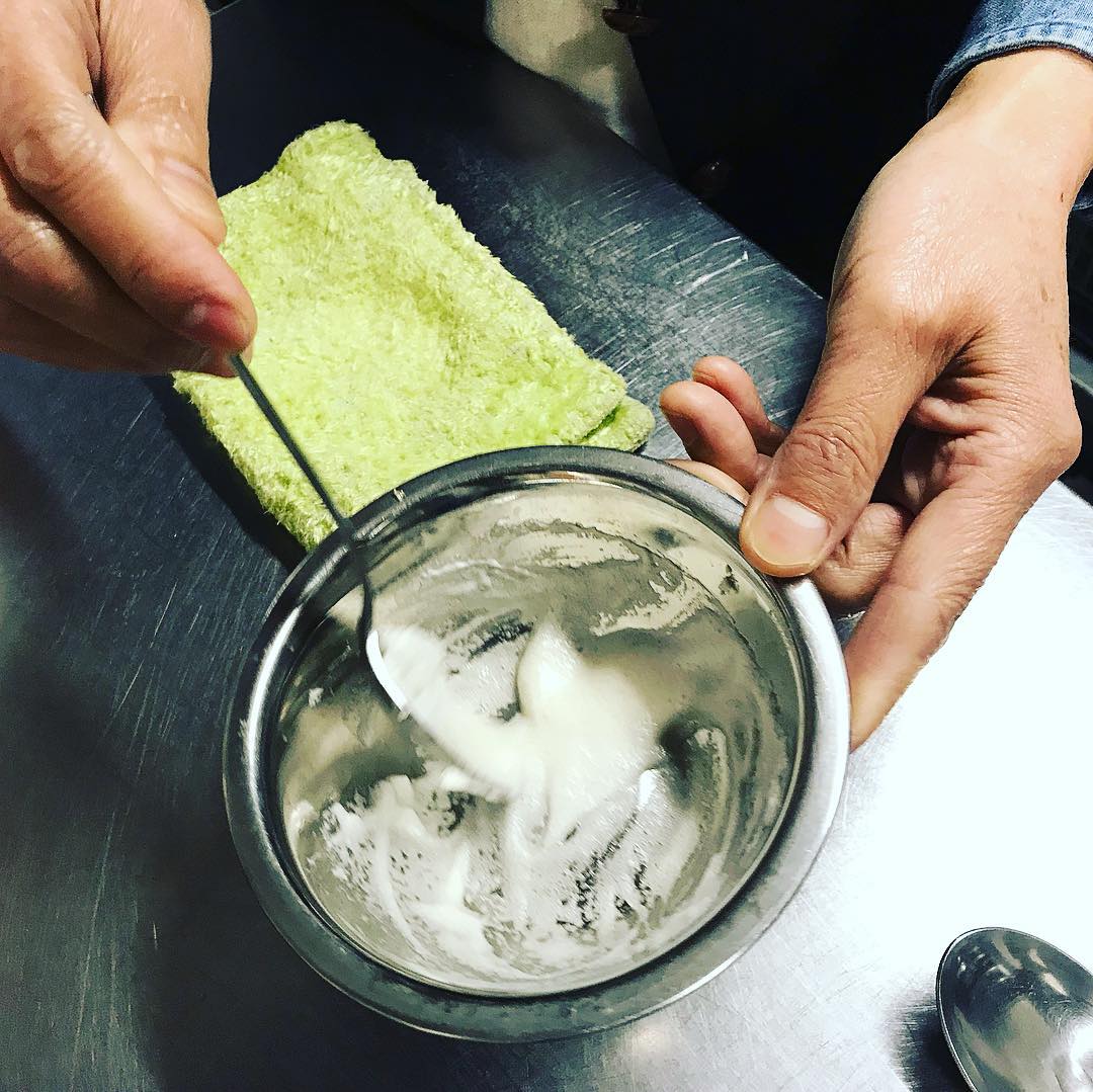 大豆を煮ると出てくるこの泡がメレンゲの代わりになるという、どうやら世紀の大発見らしいのです。