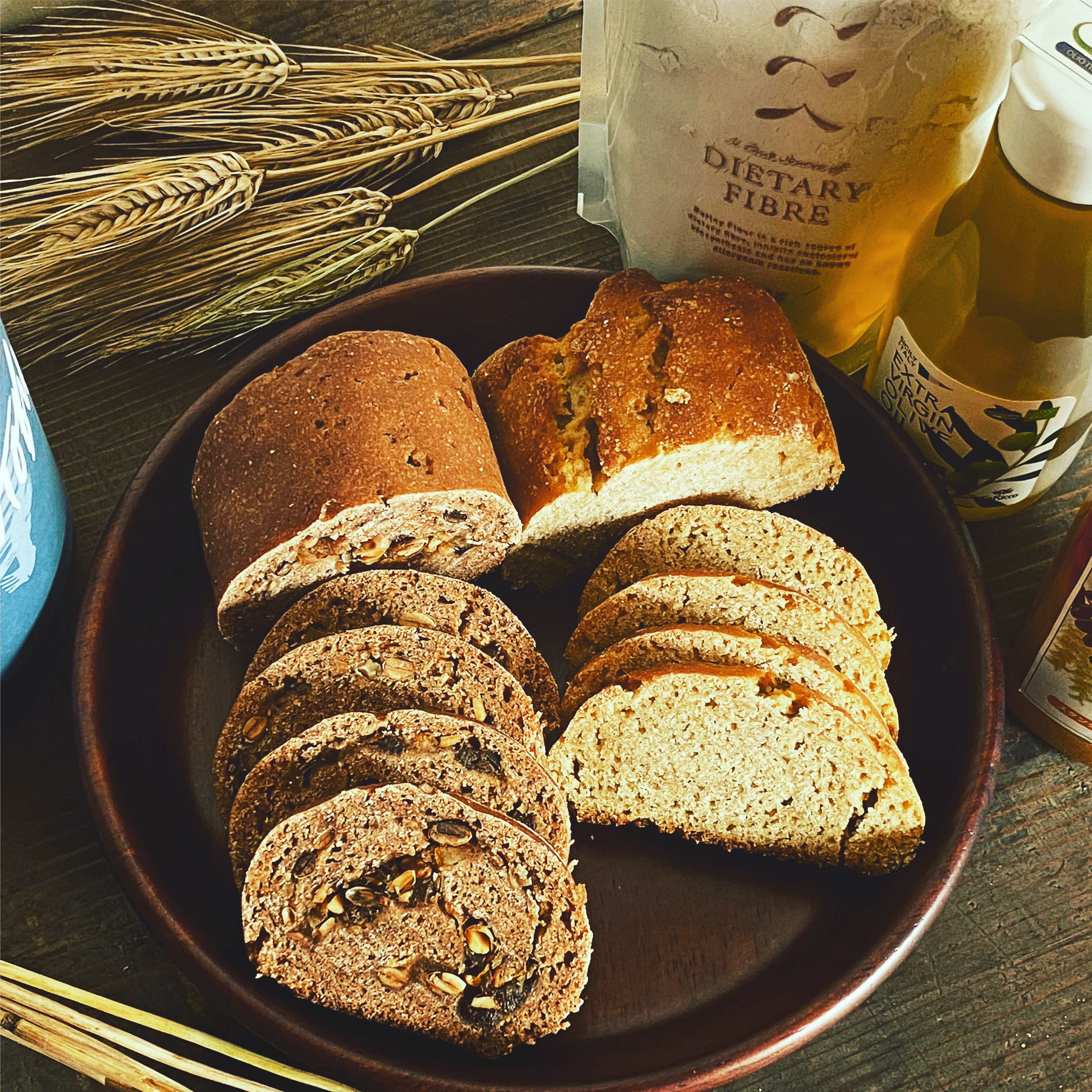 大麦粉は小麦粉の3倍食物繊維が含まれているほか、グルテンを生成するグリアジンは入っていないグルテンフリーのパンになります。