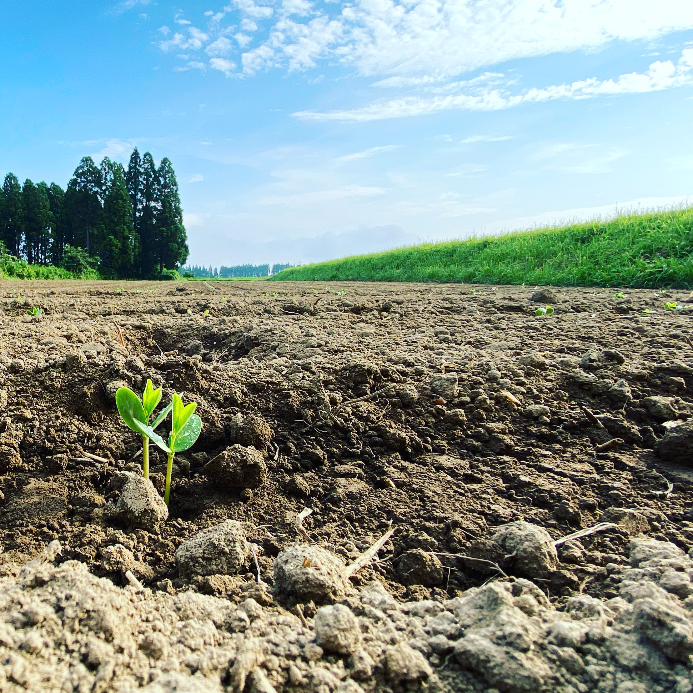 朝イチの見廻り。麻尻大豆さん、次々とこの世界に顔を出しています。 これから11月の収穫まで、大空に沢山葉を広げていってください。他の草に邪魔されないように、キチンとサポートしていきます^ ^ #大豆 #麻尻大豆 #在来種