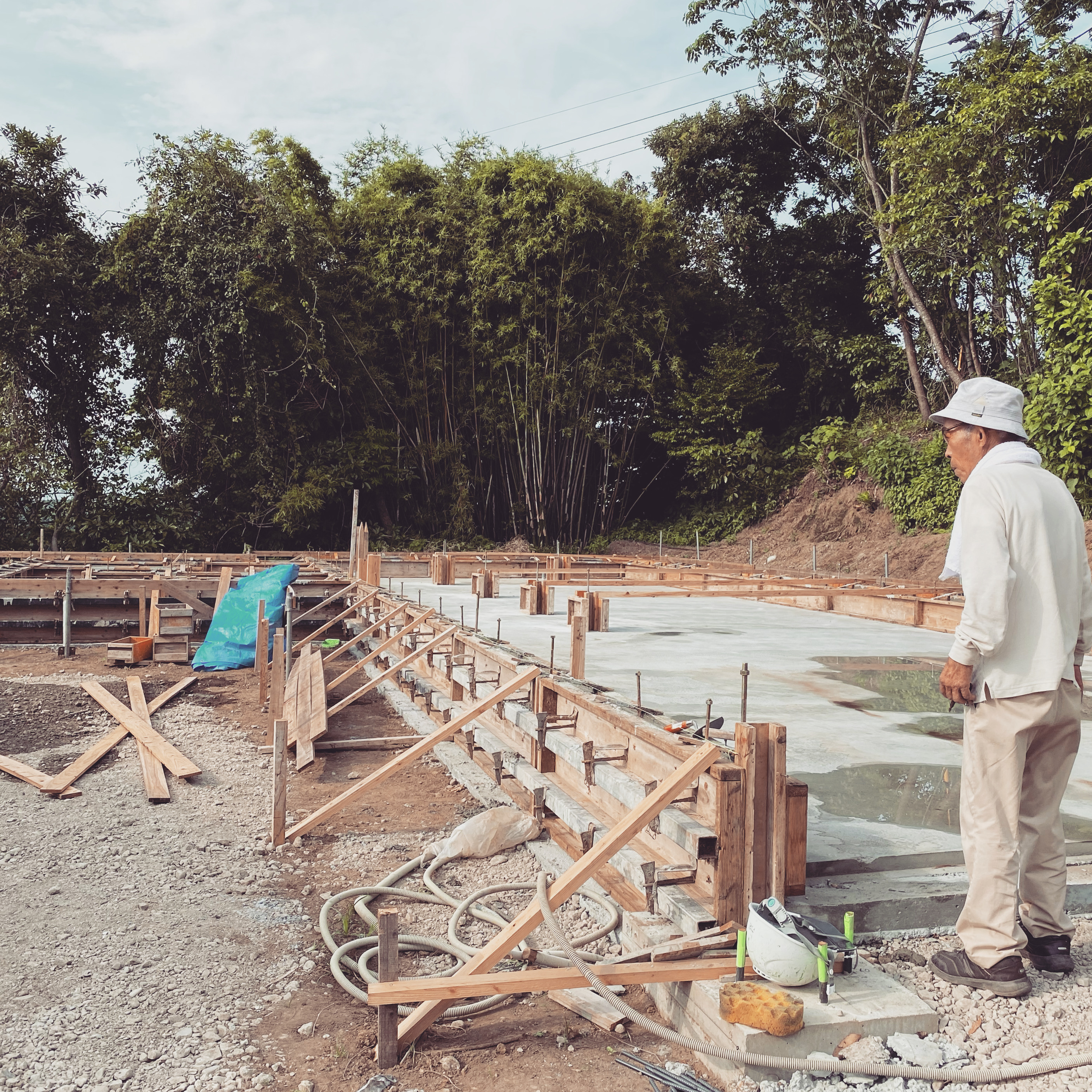 倉庫の基礎が完成間近。こちらは順調に進んでいますが、畑はちょっと困ったことになりました。