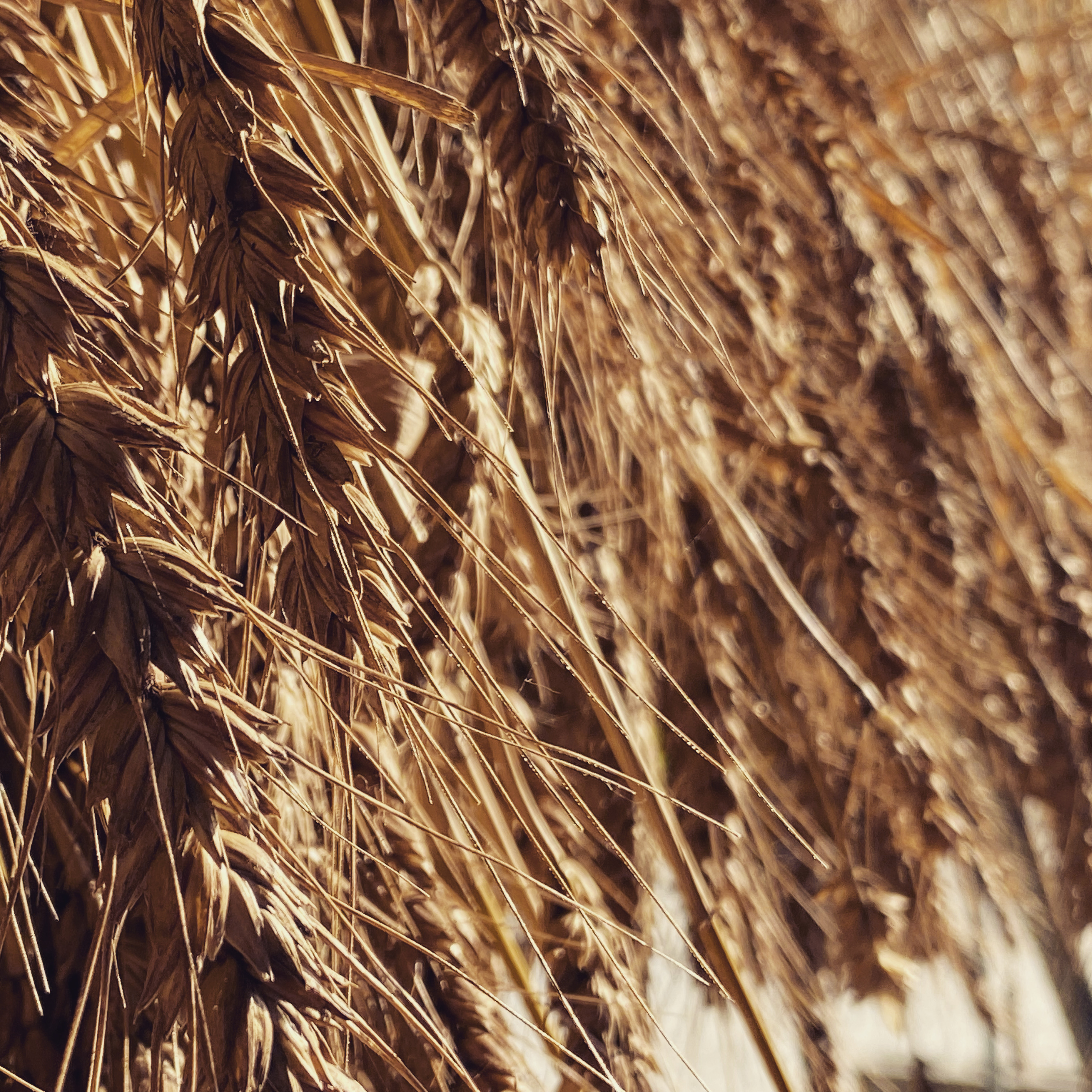 畑を去る夕暮れ時、軒下に干していた小麦が西日に美しく輝いて、私は種をくれた方の笑顔を思い出していました。