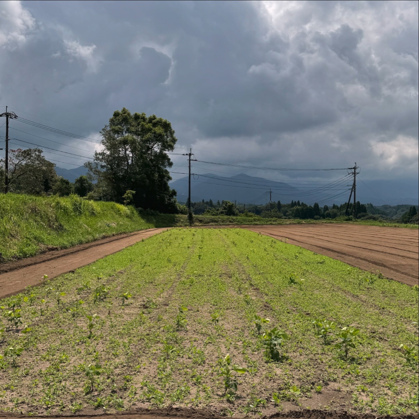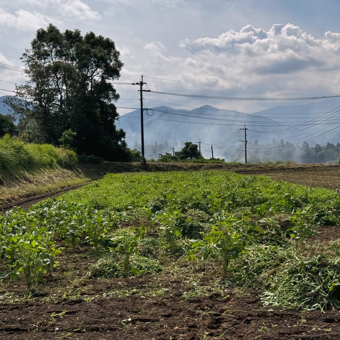 大豆が光を遮らない丸裸の畑は、夏の日差しの中で草だらけに。(2枚目)