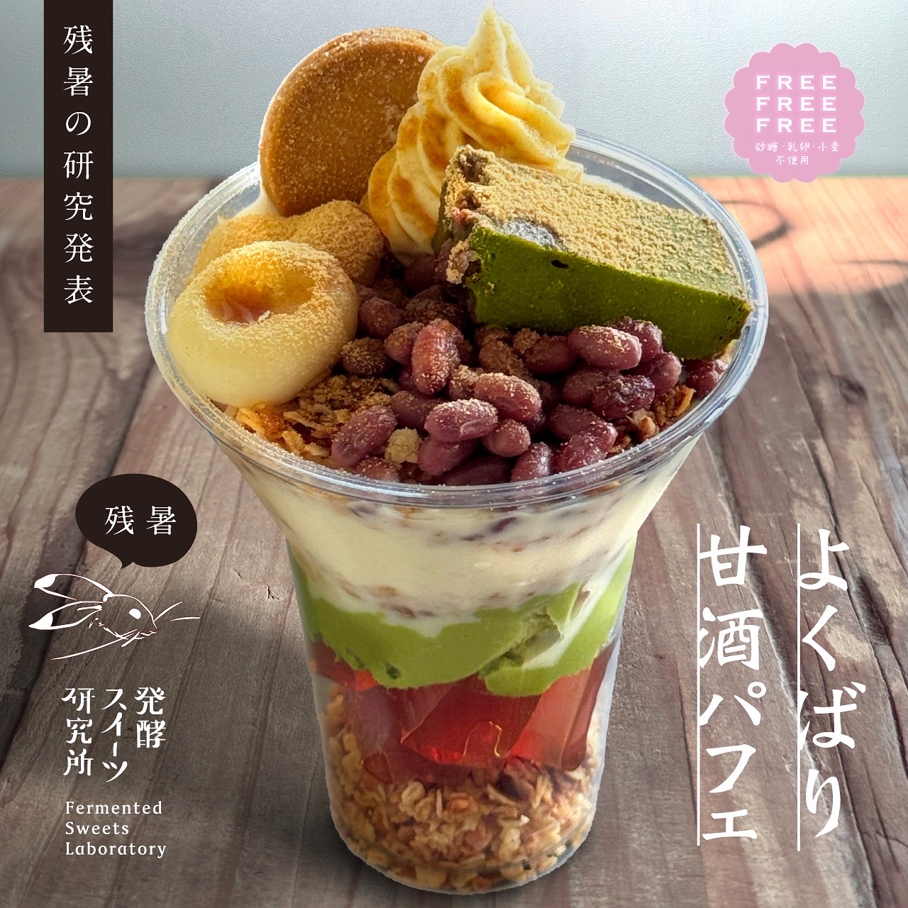 砂糖・乳卵・小麦を使わないでつくる発酵スイーツ。甘味は甘酒で作ったり、発酵たっぷりのパフェが完成しました。