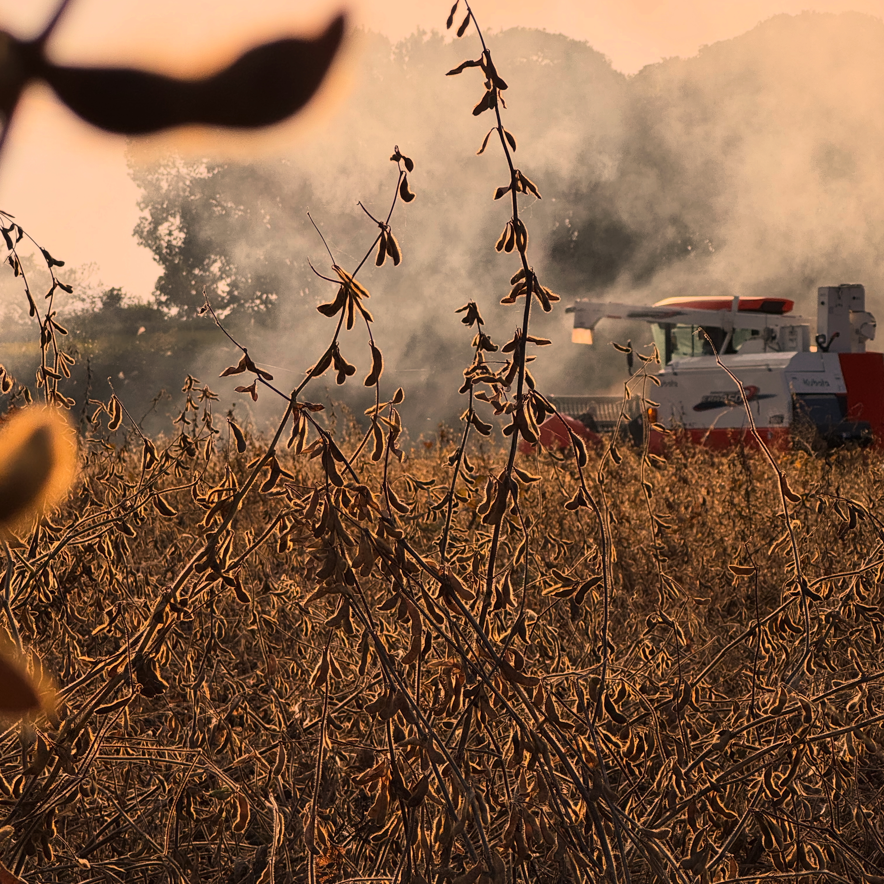 西陽に照らされ黄金色に輝く大豆の鞘は、新年へと続く艶やかな光です。