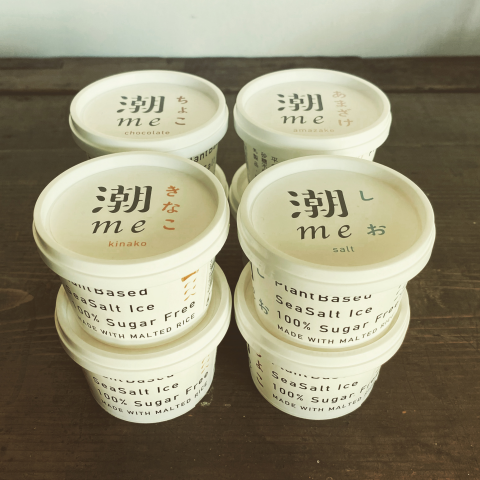 #潮me アイスは私たちの作っている沖の潮を存分に生かしながら大豆をふんだんに使い、乳・卵不使用、砂糖も不使用のプラントベースなアイス。