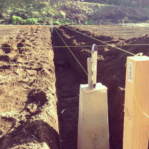 ハウス建て込み 2日目。ユンボもビームの水平器も持ち合わせていないのでスコップと水糸、己の体力のみ。根石が80キロあるので容易に動かせず、調整も大変。これはまだ根石を穴掘って入れただけです。 #作業場