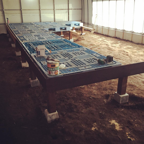 @agriartettchan ハウスの中だから雨を気にしなくていいし、コンパネ自体重いから結構しっかりするよ。上は農業資材の白いビニール製の布で覆って完成です。電ノコが欲しくなってきました。。