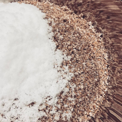 写真は麹に塩を混ぜる塩きりという作業をしたところ。この時点で麹菌は死滅して役割を終えます。麹菌はカビなので、塩の浸透圧で細胞が破壊されてしまうのです。