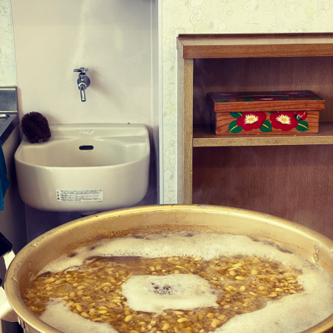 本日は福岡の堅粕保育園さんでみそづくり。ゆっくり大豆をコトコト煮ています。