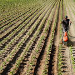 大豆の中耕作業は真夏の炎天下で行われる、一年の中でもっとも過酷な作業のひとつ。