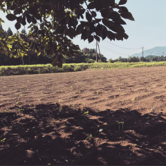この大豆はリビングマルチのために4月に蒔いた大豆。リビングマルチとは、畝と畝の間に敢えて草を生やし、影をつくることで草を生えなくするというものです。