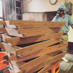 麹:操業80年以上の老舗にて、昔ながらのモロブタ製法で仕込んだ麹