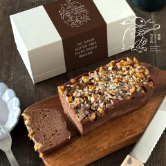 大麦粉をふんだんに使ったしっとりカカオ生地に、歯応えのあるくるみをのせました。砂糖・乳・卵・小麦を使用せず、有機素材のみを使用したガトーショコラです。