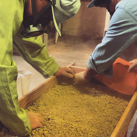 蒸した大豆と、小麦を焙煎して粉砕したもの、醤油の種麹(カビの元)を混ぜ合わせて、室で二日間温度管理して大豆に麹カビを沢山生やします。