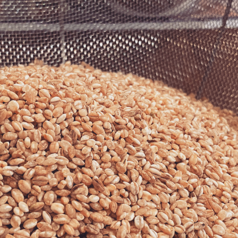 ここくの麦は在来種のため粒が小さく、色も麦本来の黄色をしています。ミネラルが多く含まれている表皮をあまり削らずに五分付きで精麦することで、歯ごたえを残しているからプチプチおいしい。